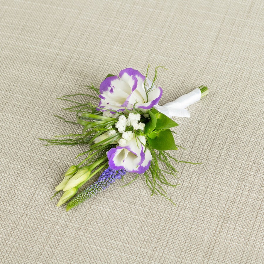 Such precious little things like buttonholes play a very important role on a wedding. Our Lilium & Lisianthus Groom Buttonhole contains White-purple Lisianthus, Purple Veronica, Gypsophila and Aralia leaves. It will suit to every groom.