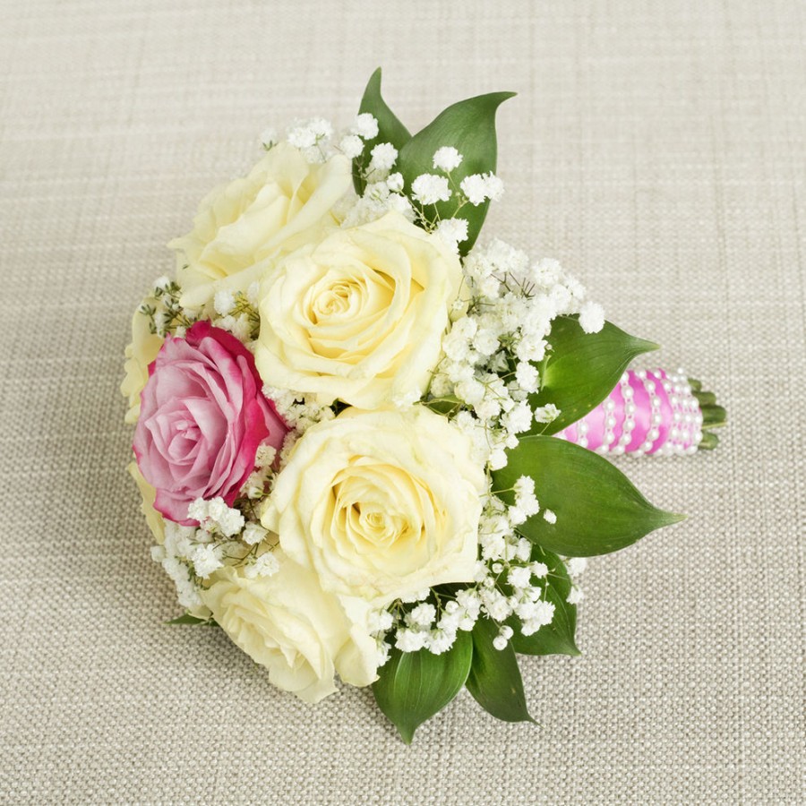 We've arranged this elegant bridesmaid bouquet of Pinkish-purple Roses, White Creamy Roses, Gypsophila and Aralia leaves for every bridesmaid with style.